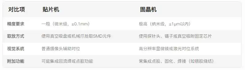 贴片机是电子制造业的基础设备,面向标准化SMT流程;而固晶机是高精度封装领域的专用设备,服务于芯片级精密组装。两者在精度、功能和适用场景上有明显区分。