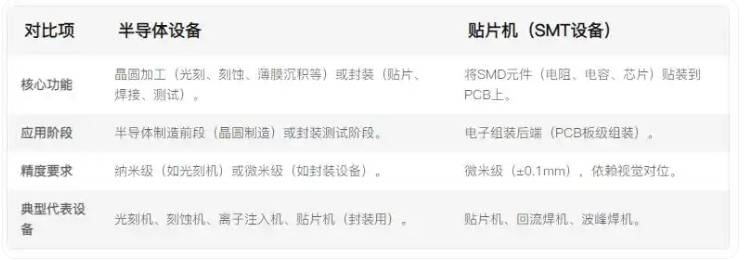 贴片机是电子制造业的基础设备,用于SMT组装;半导体设备则聚焦于芯片制造和封装的核心工艺(如光刻、刻蚀、封装)。两者在功能、精度要求和产业链位置上有显著差异。